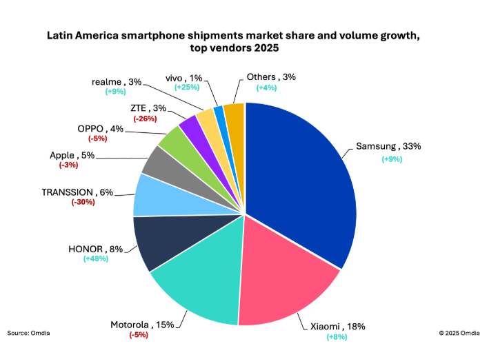 El cuadro de los primeros cinco lo completan HONOR, que viene tomando posición importante en la región, con un despacho de 11,8 millones de unidades y un crecimiento en envíos de 48% en el año, el más alto registrado por alguna marca. Finalmente cierra TRANSSION, que despachó 8,9 millones de unidades.